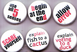 Literary Arts gave out buttons at our booth at Wordstock. They’re writing prompts! Here, in their entirety, are the prompts we came up with in preparation for last weekend. Feel free to make your own buttons, and if you need a writing prompt, well …