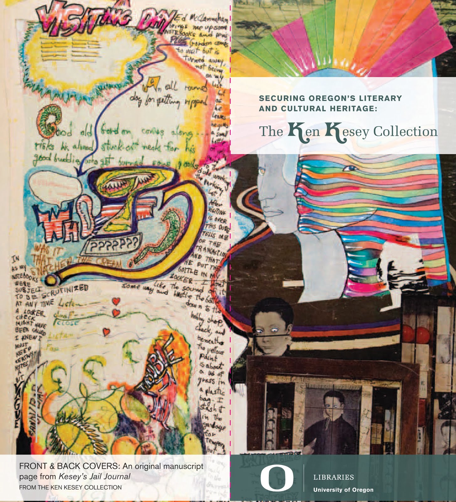 According to the University of Oregon library, “The Ken Kesey Collection contains irreplaceable typewritten manuscripts, artwork, collages, photographs, and correspondence, dating from 1960 to 2001. This rich archive is a resource for students and scholars interested not only in Ken Kesey and his writing but also in the literature and culture of the 1960s.”