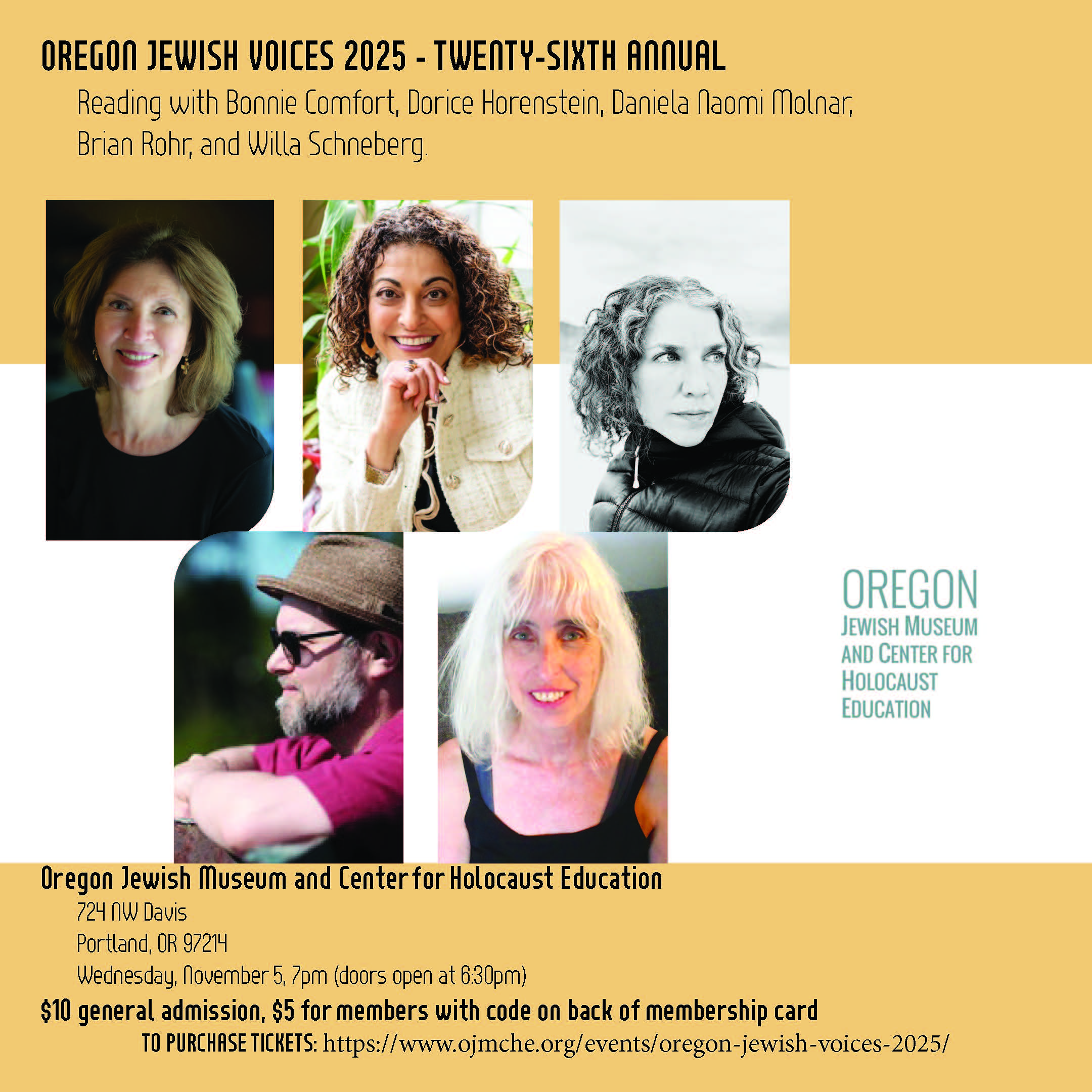 Started in 1999 and organized by writer Willa Schneberg, this annual event features readings by prominent Oregon Jewish poets and writers. This year marks the 26th anniversary of showcasing Oregon Jewish writers. The writers in the 2025 program span a range of genres, and each will share selections from their work. The authors this year are memoirist Bonnie Comfort, inspirational speaker Dorice Horenstein, poets Daniela Naomi Molnar, Willa Schneberg and Brian Rohr.