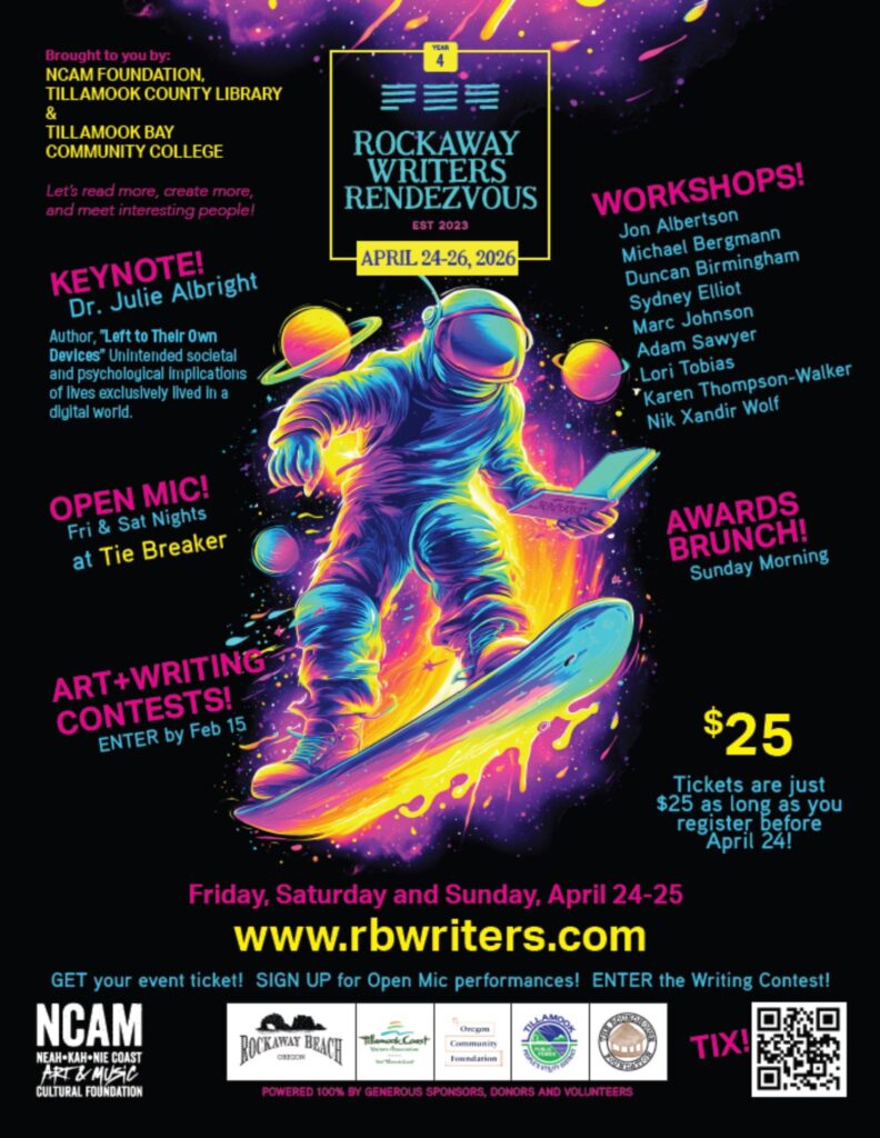 The 4th annual ROCKAWAY WRITERS RENDEZVOUS 2026 features a full day of workshops and a keynote, two evening open mic performances, writing and visual art contests, winners published in annual Anthology. Spend the weekend in Rockaway Beach to be inspired by and network with like-minded creatives with a wide range of experience. See website for contest rules and complete schedule. All proceeds benefit the Neah Kah Nie High School Scholarship Fund for students pursuing careers in the arts!